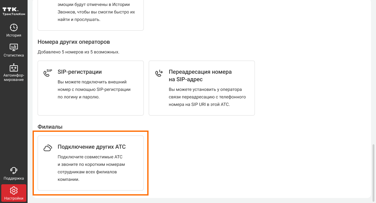 1. Перейдите в раздел «Еще», в самом низу перейдите в раздел «Филиалы» → «Подключение других АТС».