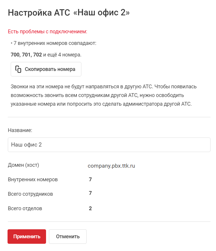 Это не будет препятствовать подключению одной АТС к другой, однако сотрудникам, которые имеют пересекающиеся номера, нельзя будет позвонить из другой АТС. При подключении появится сообщение с предупреждением: