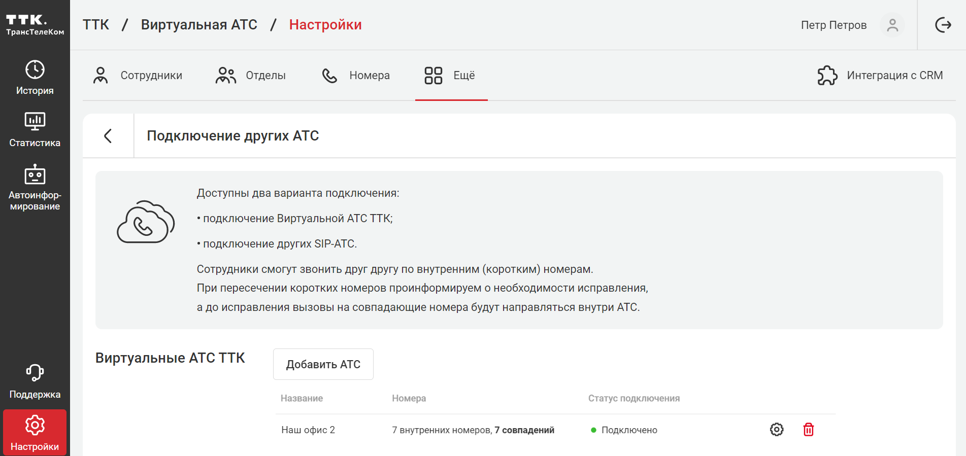 Больше настроек для сотрудников других АТС, подключенных к Виртуальной АТС, описаны в статье Сотрудники из разных АТС: