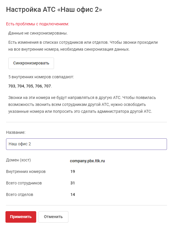 Если автосинхронизация не произошла, в настройках подключения к другой АТС появится кнопка «Синхронизировать». Нажмите ее, чтобы выполнить синхронизацию вручную.